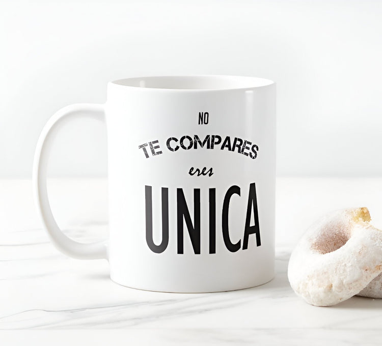 Mug Taza Pocillo Café con mensaje positivo, Regalo motivacional NO TE COMPARES ERES ÚNICA