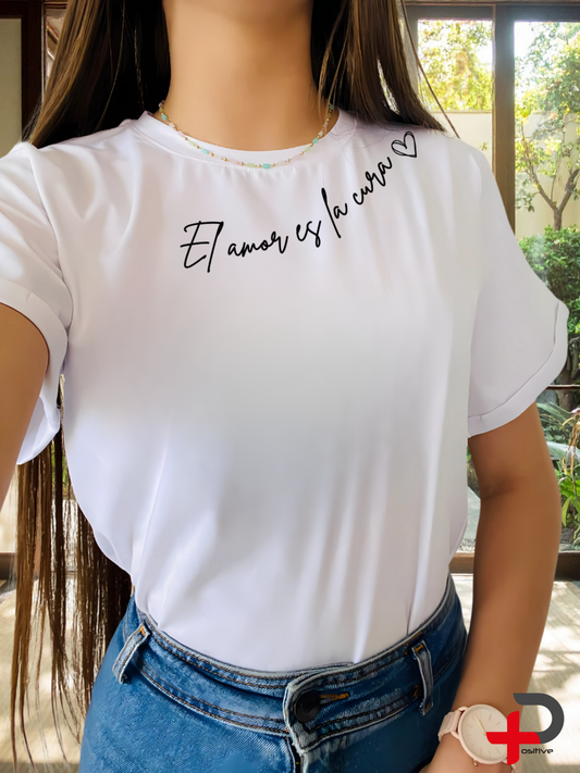 Camiseta básica estampada para mujer, mensaje, positivo, motivacional. (El amor es la cura)